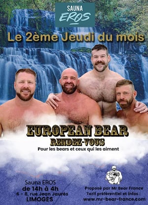 Le deuxième jeudi de chaque mois, à Limoges, " L' European Bear Rendez-Vous " est organisé par Mr Bear France pour rencontrer les ours Limougeauds (et des environs) au Sauna EROS - 6 - 8, rue Jean Jaurès pour un après-midi (et /ou une soirée) de détente et de convivialité Tarif spécial (10 €) sur présentation du PASS imprimable sur notre site Internet ou à télécharger sur votre smartphone
