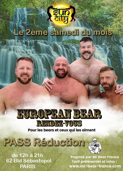 Le second samedi de chaque mois, à Paris, l'European Bear Rendez-Vous est organisé afin de rencontrer les ours Parisiens et les touristes du monde entier au sauna Suncity - 62 Boulevard de Sébastopol pour un après-midi de détente et de convivialité. Tarif Spécial 22 € au lieu de 25 € (+ soft drinks à volonté) sur présentation du Pass de Réduction Imprimable sur ce site